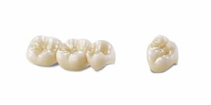 | A common alternative to all-metal crowns are crowns made by fusing porcelain to metal. With these dental crowns, a patient has the advantage of the strength of metal, but the porcelain overlay can be color-matched to teeth. With a porcelain-fused-to-metal crown, the porcelain may eventually chip, exposing the metal beneath. Patients may also be able to see a dark line where the crown meets the gumline. |